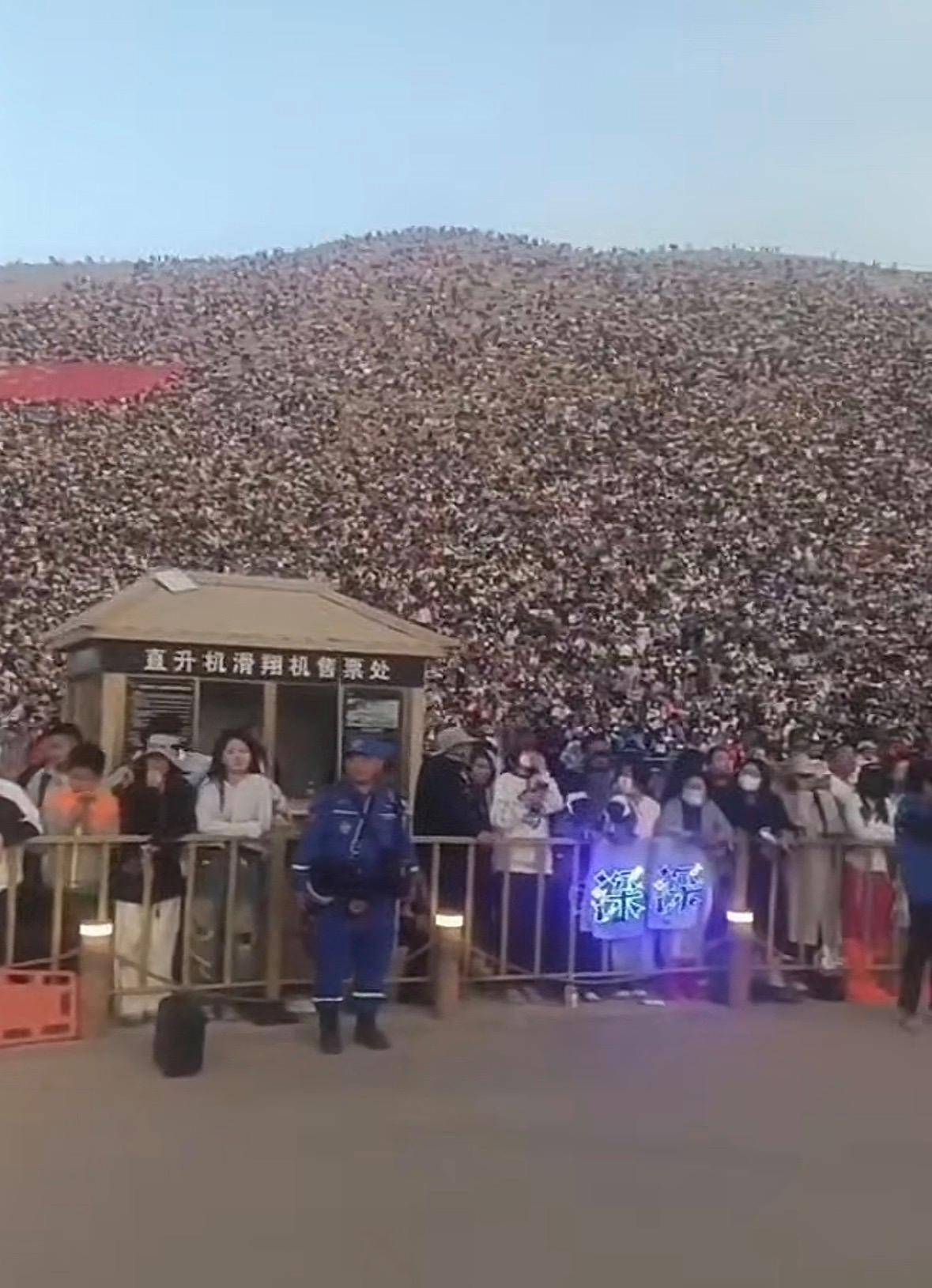 5月4日,甘肃省敦煌市新月泉景区一民宿雇主发布视频,视频中的新月泉景区格外壮不雅,景区中的一座沙山更是挤满了东说念主,更有网友玩笑,“齐快看不见沙子了。”