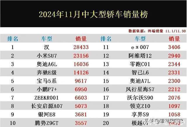 近期乘联会发布了2024年11月的汽车销量数据,狭义乘用车销量保抓了16.6%的同比增长,而在中大型轿车商场,11月份的销量名次榜也崇拜出炉,从前十排名来看,比亚迪和小米上风显明开云体育(中国)官方网站,同期前十中仅有BBA三款燃油车型入榜,其余车型均为新能源车,接下来咱们就来望望各款车型的弘扬。