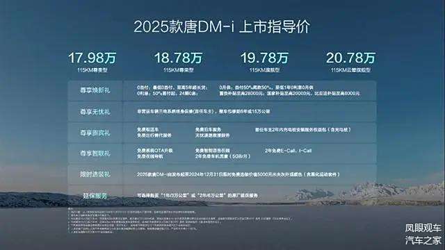 近日,比亚迪2025款唐DM-i焕新上市,从贪图、时期、确立三个方面全面升级。新车共推出4款车型,售价17.98万~20.78万元。车身尺寸:4870X1950X1725mm,轴距:2820mm,均带FSD可变阻尼悬架。