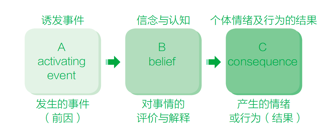 外界刺激事件A,通过中间经过运作的机制(即是咱们脑海当中对事件产生的信念B),产生了不一样的情感及行动后果C。因此,如果信念B莫得更正,咱们的行动是不会发生更正的。