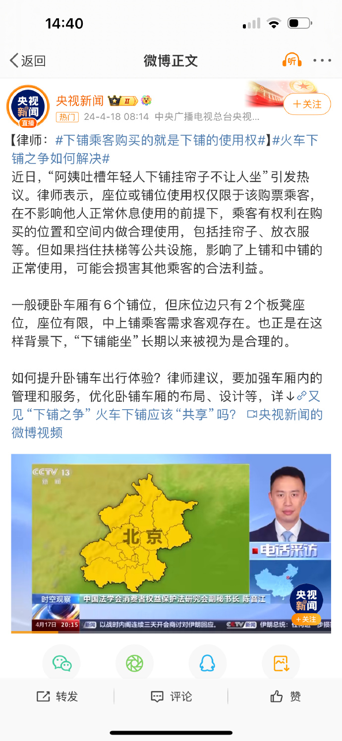 再次强调,我不是在说这个案例,我是在相关下铺要不要拉帘子、给不给上铺的东谈主坐一下的这个问题,我谢谢你们了。