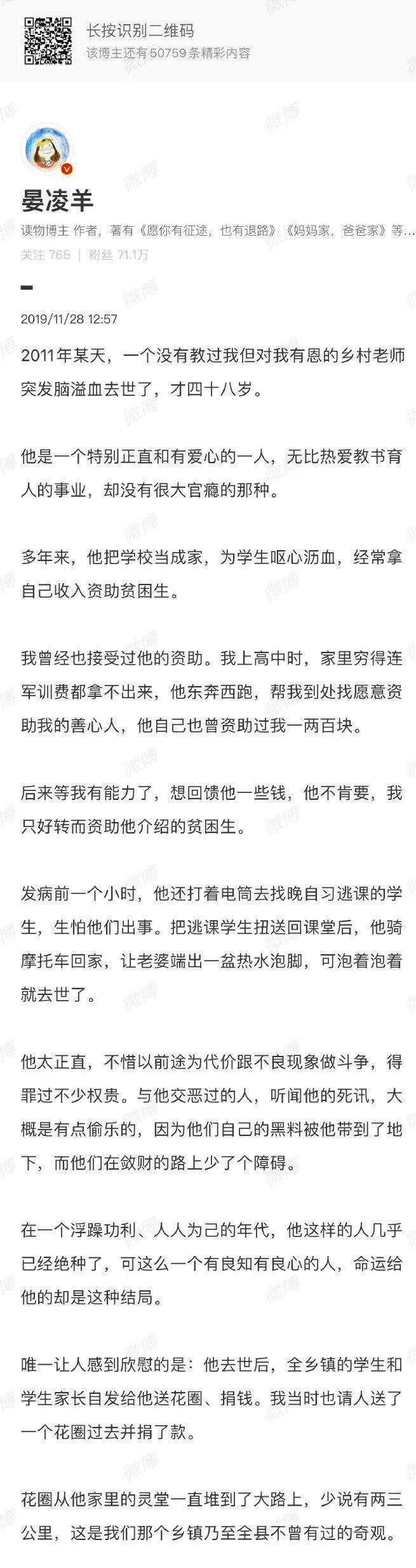 就拿我图中说的这个憨厚来说,天然他暴毙了,但他帮过的学生(包括我),只须他家东谈主有求,专家必应。