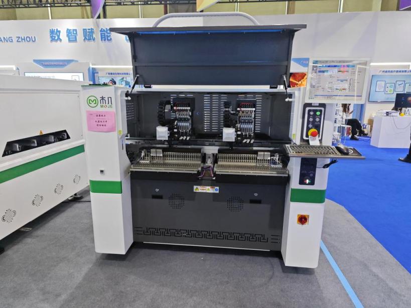 广东木几智能装备有限公司展出的多功能贴片机,引起了来访者的意思意思。公司副总司理温妮先容,这款多功能贴片机,与同类家具比拟提速35%以上,极大耕种了电子元器件出产效力。