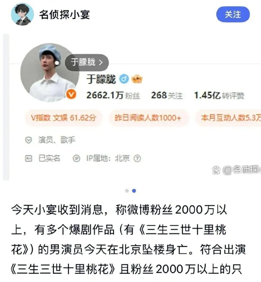 9月11日,文娱圈一则爆料苟且坦然——狗仔“小宴”发文称,一位粉丝量超2000万、出演过《三生三世十里桃花》的古装剧男演员,在北京苦难坠楼身一火。音信刚出,网友便运转凭据思绪排查开yun体育网,很快将眼神聚焦到了演员于朦胧身上。