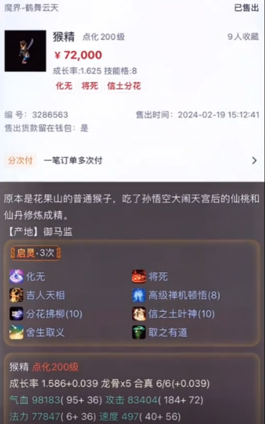 一只被誉为全服第一的猴精,当先的标价高达35万元,足可见其突出进程,而近日这只宝宝也终于成交啦!
