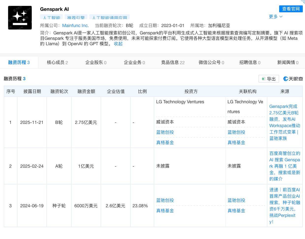 11月20日,位于好意思国加州帕洛阿尔托的AI搜索引擎Genspark(附庸于公司Mainfunc Inc.,下称:Genspark)完成2.75亿好意思元B轮融资,投后估值达12.5亿好意思元。